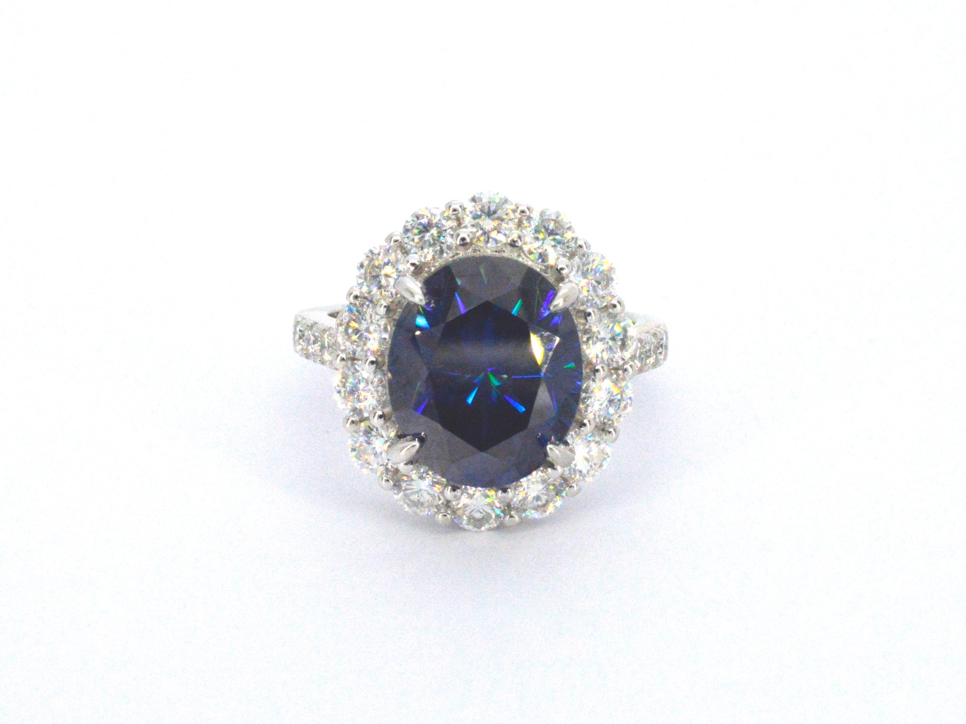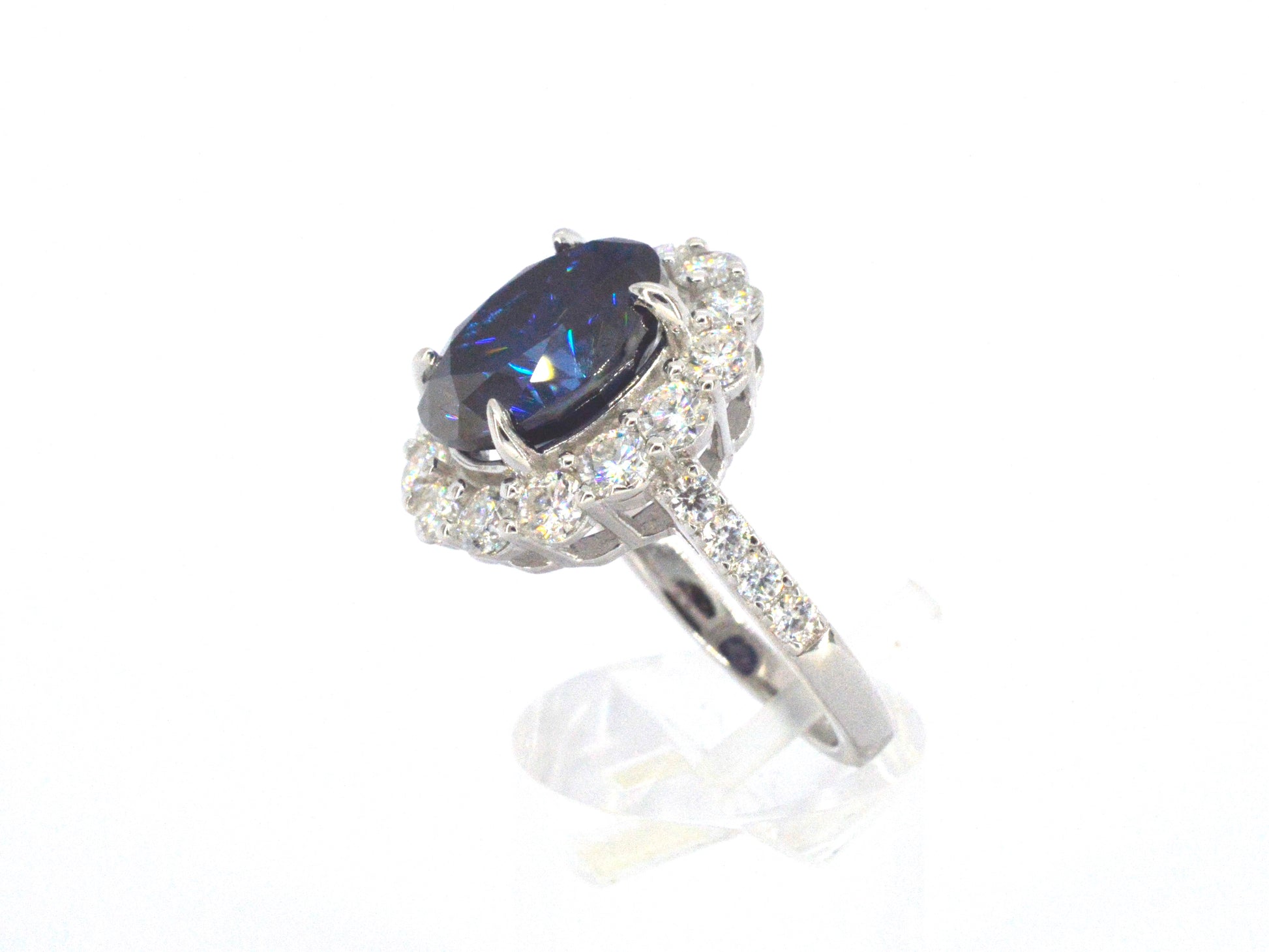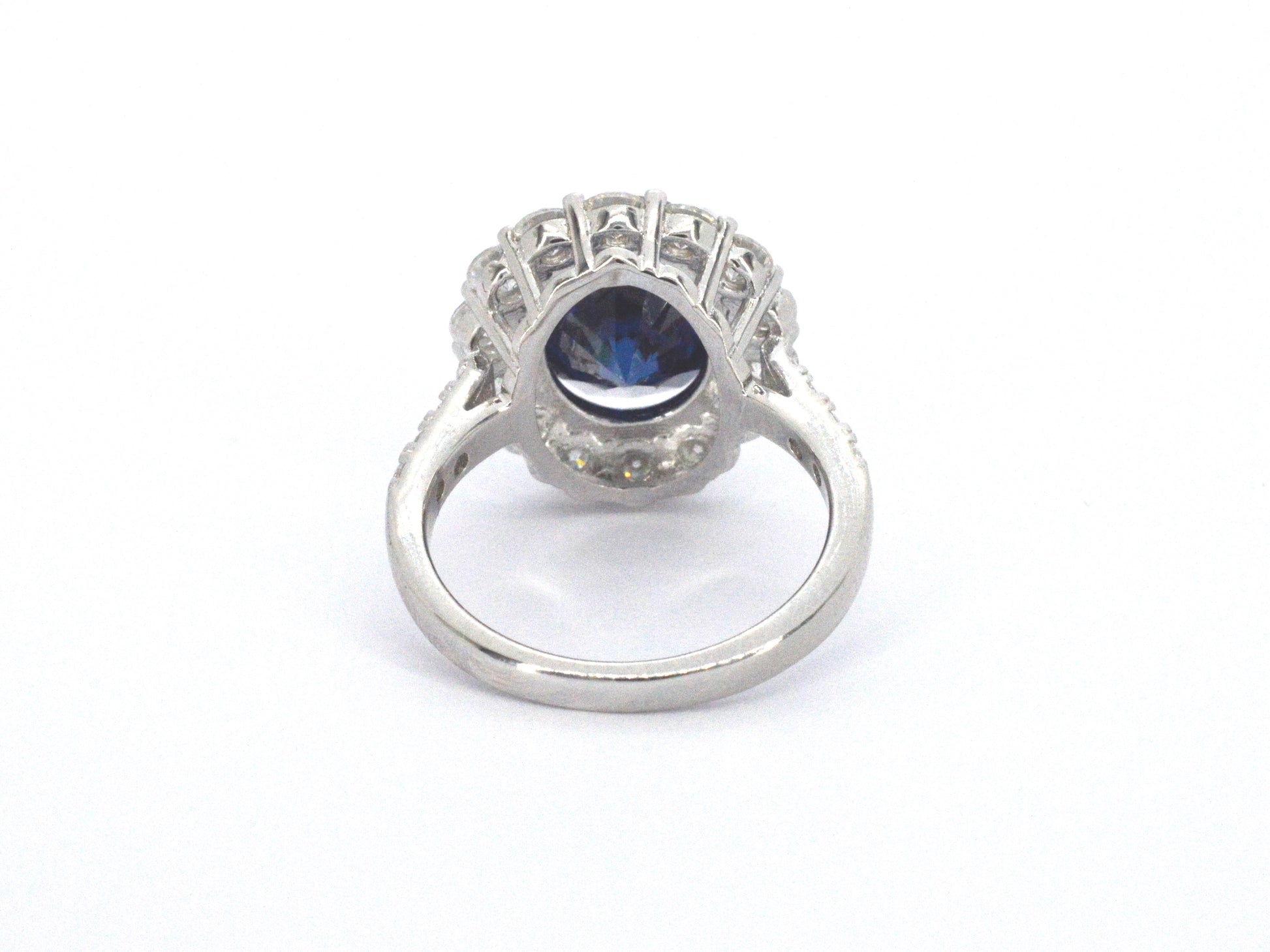 Entourage ring met witte briljanten en een grote saffier blauwe ovaal